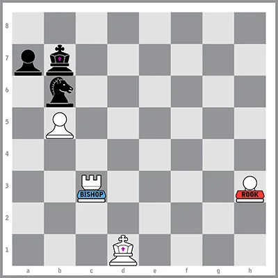 White RookBishop moves to c6, check. Black King escapes check by moving to b8 (only option). White PawnRook uses it's Rook vest power to move to h8, promotes to Queen, check. Black Knight blocks check by moving to c8 (only option). White Queen on h8 captures c8, checkmate.